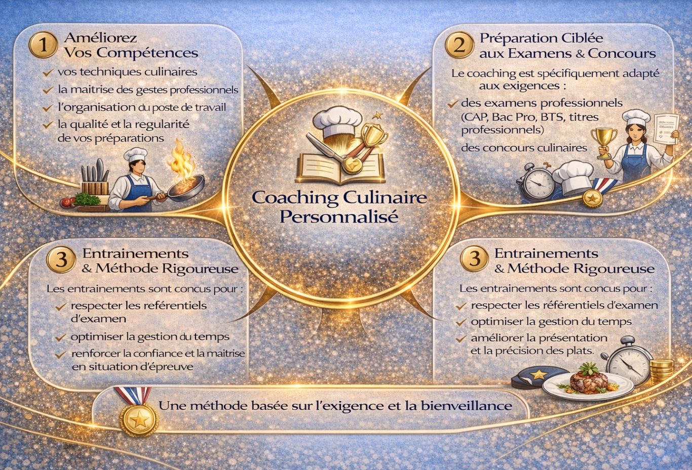 Soyez coaché par un chef expérimenté, doté d’une solide expérience dans les métiers de la restauration et de la formation, et développez vos compétences culinaires de manière structurée et efficace.